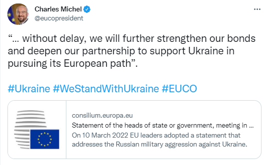 欧洲理事会主席查尔斯·米歇尔(Charles Michel)毫不拖延地表示,欧盟领导人“将进一步加强我们的联系,深化我们的伙伴关系,以支持乌克兰走上欧洲之路”。