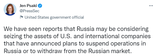 普萨基在一系列推文写道:“我们看到有报道称,俄罗斯可能正在考虑扣押已宣布计划暂停在俄罗斯运营或退出俄罗斯市场的美国和国际公司的资产。”