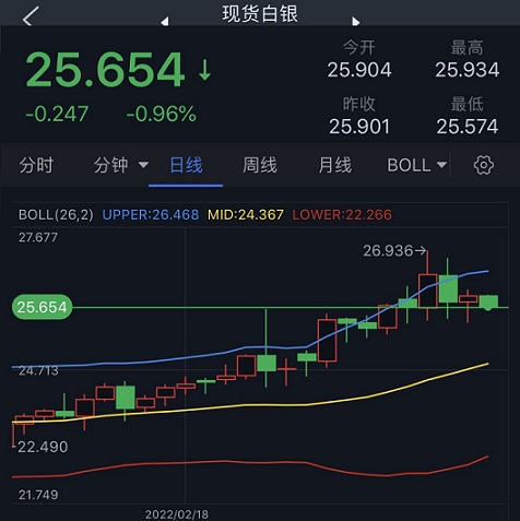 Economies.com在文章中写道,银价昨日上涨并测试关键阻力25.95美元/盎司,目前银价维持在上述水平下方。值得注意的是,随机指标目前传递负面i新年好,这支持银价在未来一段时间继续看空趋势的可能性,下一主要目标位于25.05美元/盎司。