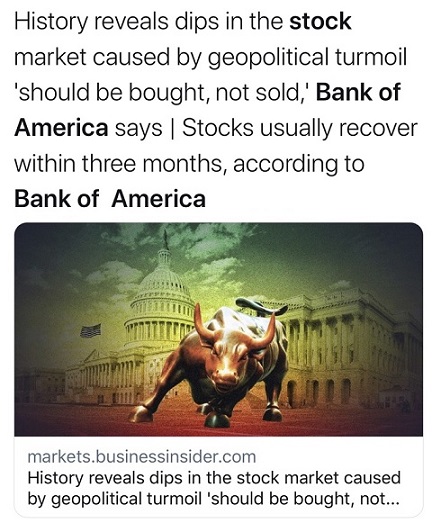 美银表示:“简而言之,历史告诉我们,因地缘政治发生下跌时,应该要进场,而不是抛售出场。”