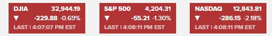 道琼斯指数下跌229.88点或0.69%,收于32944.19点。标准普尔500指数下跌1.30%至4204.31点。以科技股为主的纳斯达克综合指数下跌2.18%至12843.81点。