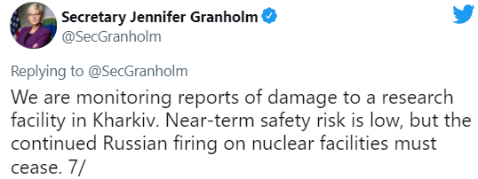 美国能源部长詹妮弗·格兰霍姆(Jennifer Granholm)则在11日表示,美国对“俄罗斯的鲁莽行动和违反核安全原则”表示担忧。