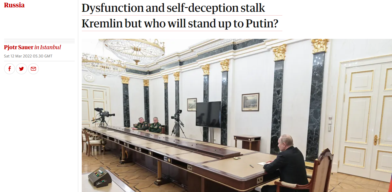 FX168财经报社(香港)讯 驻莫斯科自由记者绍尔(Pjotr Sauer)在英国卫报发表专栏评论,近期多篇文章谈到俄罗斯总统普京无法完成快速攻占乌克兰基辅的计划,其政权恐怕将因此告终,但俄罗斯精英阶层目前并无权除名总统,也没有迹象表明任何俄军高层有能力提出停止战争的建议。