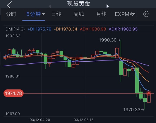 现货黄金自盘初高点1990.30美元/盎司大幅回落,最低触及1970.33美元/盎司。