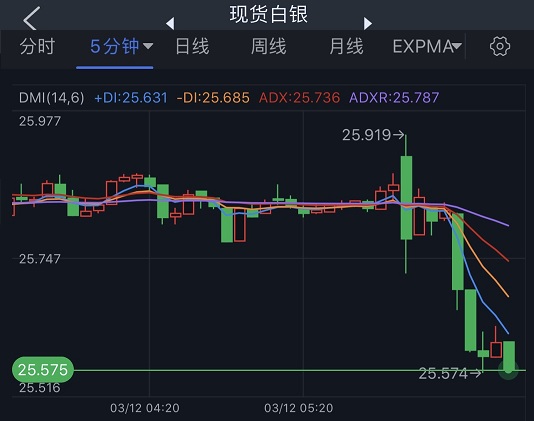 现货白银日内下跌逾1%,报25.57美元/盎司。