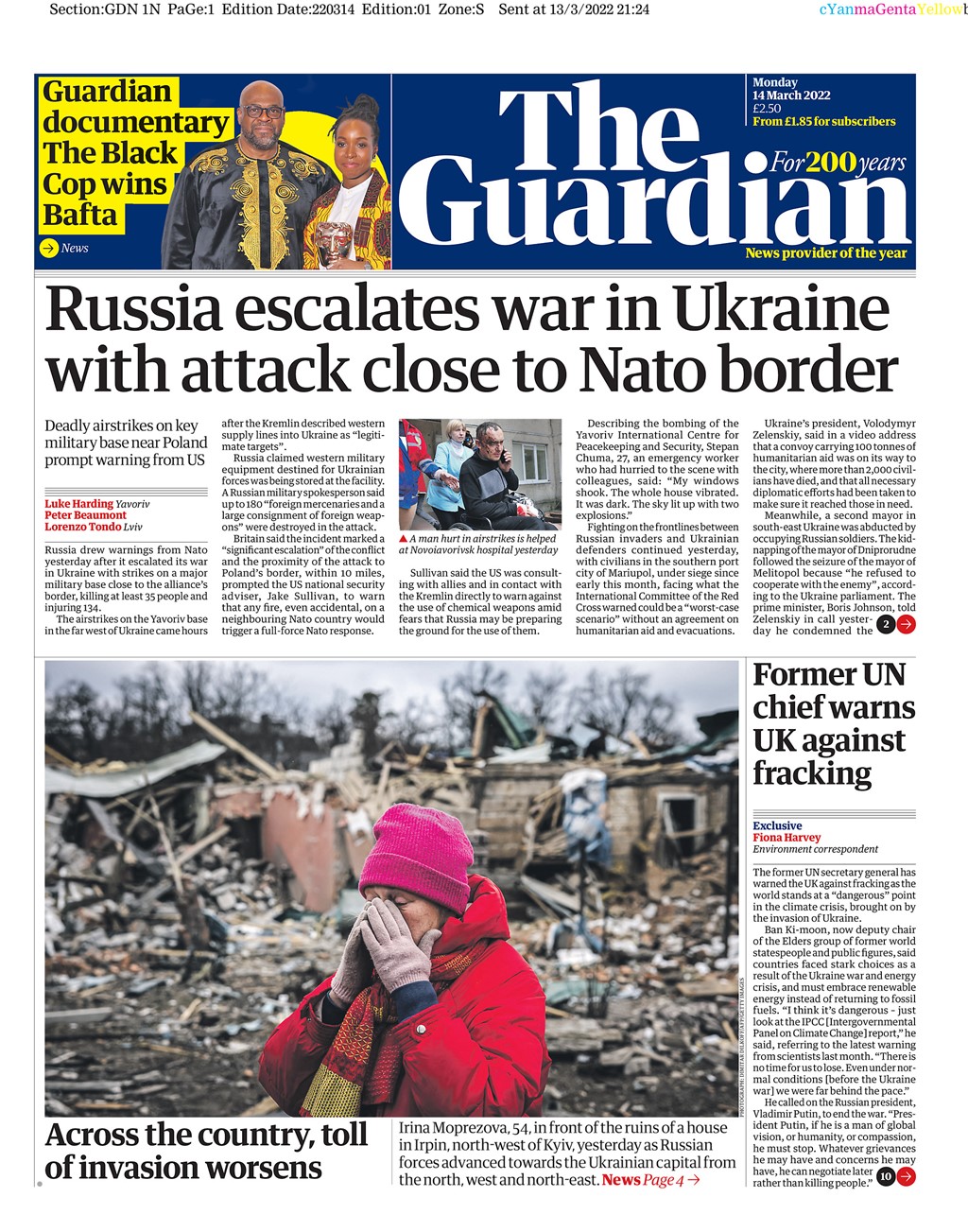 对国际维和与安全中心基地的袭击,使战斗接近波兰边境。据英国每日镜报(Daily Mirror)头版报道,俄罗斯对波兰附近军事基地发动致命袭击的事件,标志着对北约联盟的直接威胁。另外卫报(The Guardian)也提到,在克里姆林宫表示进入该国的补给资金是合法的军事目标之后,俄军袭击靠近波兰边境的一个乌克兰基地。