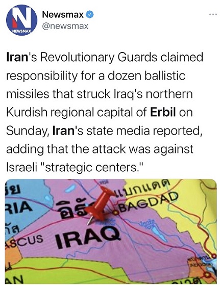 伊朗革命卫队对发生在伊拉克埃尔比勒的弹道导弹袭击事件负责,称他们的目标是以色列在该国的“战略中心”。