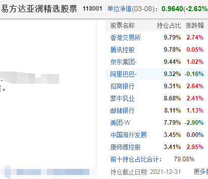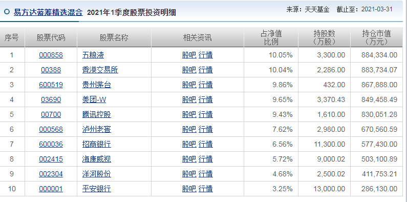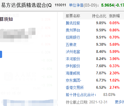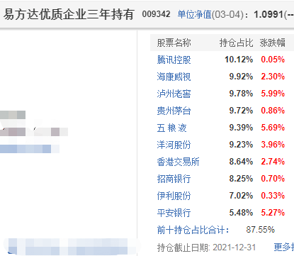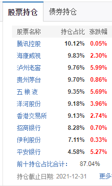 根据易方达蓝筹精选混合的2021年年末持仓来看,前十大股持仓占比87%,可谓是高度集中。从具体个股来看,食品饮料占了一半,其中,白酒类占了4家,另外,腾讯、香港交易所均属于在港上市的公司。
