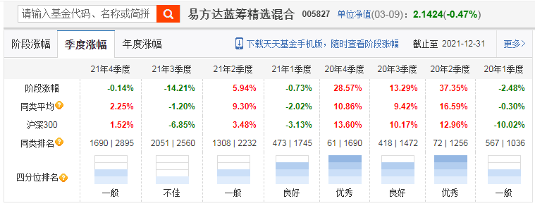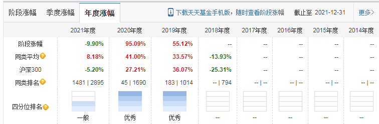 从以上业绩数据来看,易方达蓝筹精选混合在2019年、2020年分别取得了55.12%/95.09%的好成绩,这主要受益于那两年恒生科技/白酒、医药板块的出色表现。