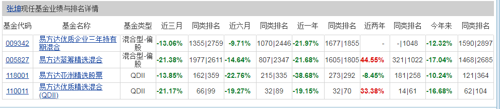 根据天天基金网的数据,张坤目前管理的四款基金中,有两款是QDII。截止2022年3月9日,旗下四款基金今年以来均处于亏损状态,亏损幅度在10%以上,其中,亏损最大的是易方达蓝筹精选混合,亏损17.04%,在同类基金中排名处于中等偏下的水平。