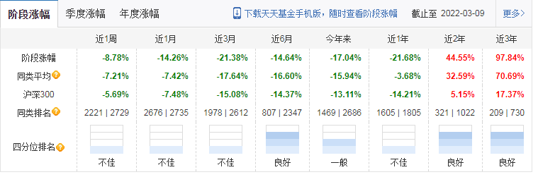 而这些板块从2021年开始出现大幅回落,于是基金业绩也就是开始出现亏损,近一年累计亏损21.68%。