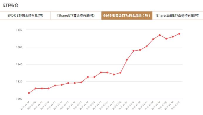 根据黄金信息网站www.24K99.com对全球8大主要黄金ETF的监控数据显示,截至2022年3月11日,全球8大黄金ETFs持仓总量为1875.417吨,与上一交易日增加3.62吨。