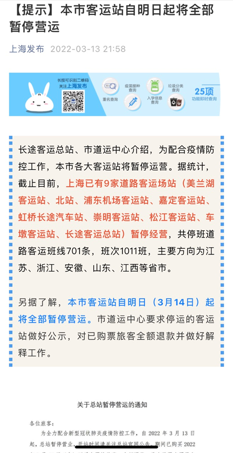 此外,上海市客运站自3月14日起将全部暂停营运。