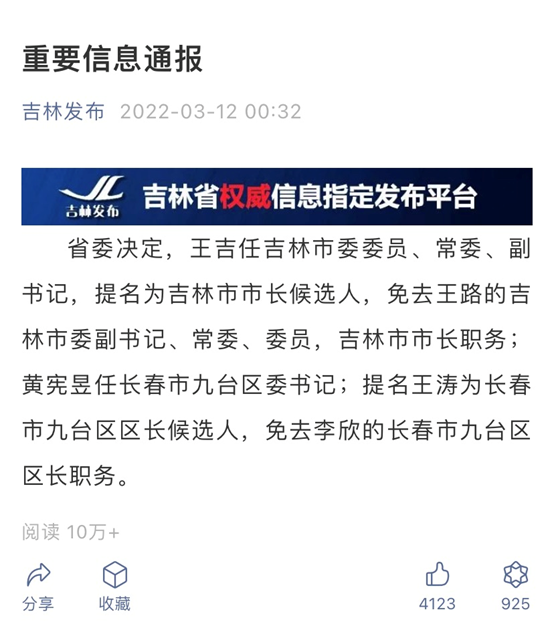 3月12日,据"吉林发布"消息,吉林省委决定,王吉任吉林市委委员、常委、副书记,提名为吉林市市长候选人,免去王路的吉林市委副书记、常委、委员,吉林市市长职务。