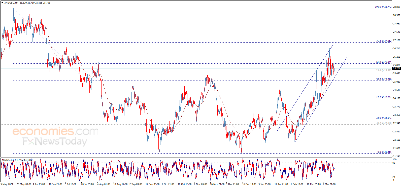 Economies.com预计,今日银价交投将位于支撑位25.10美元/盎司以及阻力位26.00美元/盎司之间。