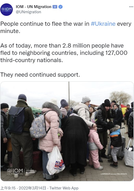 IOM周一在官方推特上表示:“人们每分钟都在逃离乌克兰的战争,他们需要“持续的支持”。