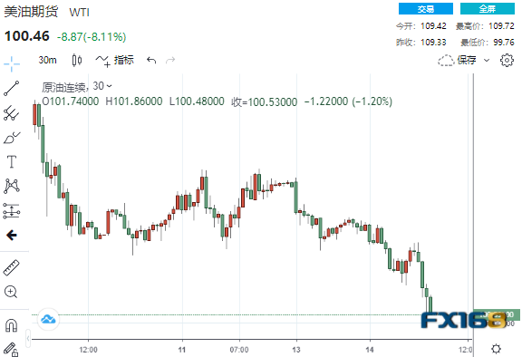 美市早盘,WTI原油短线跌破100美元大关,续刷半个月新低,日内暴跌近9%,本月振幅超35美元,布伦特原油大跌7.6%。