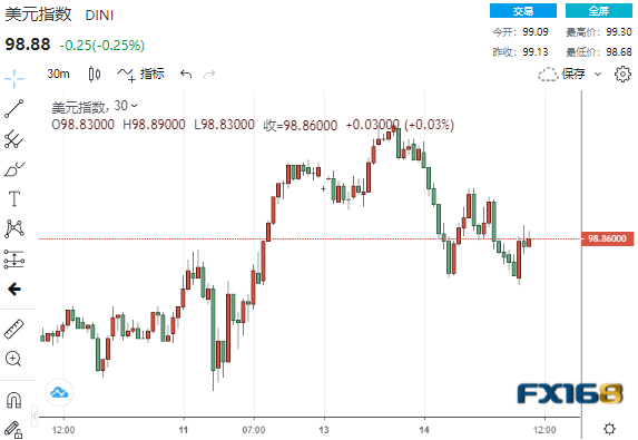 亚市盘中,美元指数上涨,接近22个月高位,但欧洲市场开盘后小幅走低,美市盘中延续跌势并刷新日低至98.68。