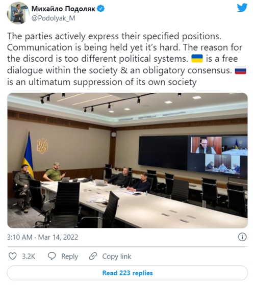 波多利亚克附上了一张这次视频会议的照片,并表示:“双方积极表达彼此的明确立场。沟通正在进行但很困难。争执的理由是政治体制差异太大。”