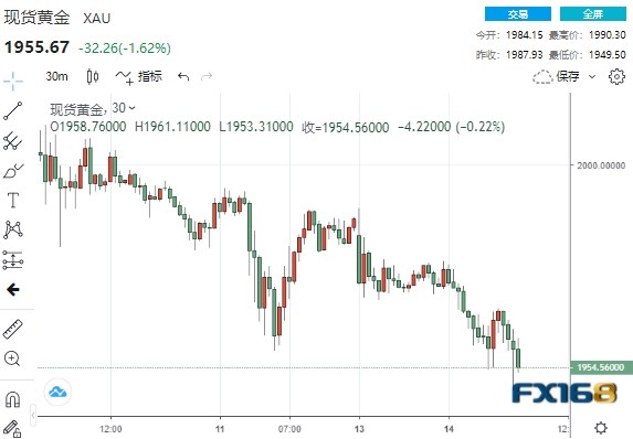 美市早盘,现货黄金短线走低近10美元,向下触及1950美元/盎司,为3月4日以来首次,日内下跌约2%,较日高则回落超40美元。