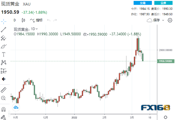 美市尾盘,现货黄金收报1950.59美元/盎司,大幅下跌37.34美元或1.88%,日内最高触及1990.30美元,最低触及1949.50美元。上周,现货黄金上涨17.78美元或0.90%。