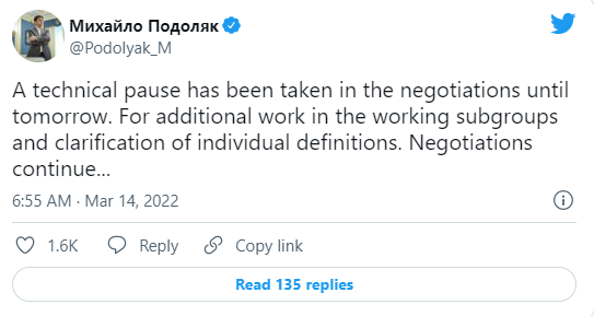 俄乌局势方面,乌克兰谈判代表波多利亚克在推特上更新说,乌克兰和俄罗斯的谈判进行“技术性暂停”,谈判将于周二继续。
