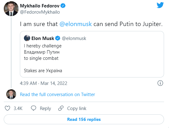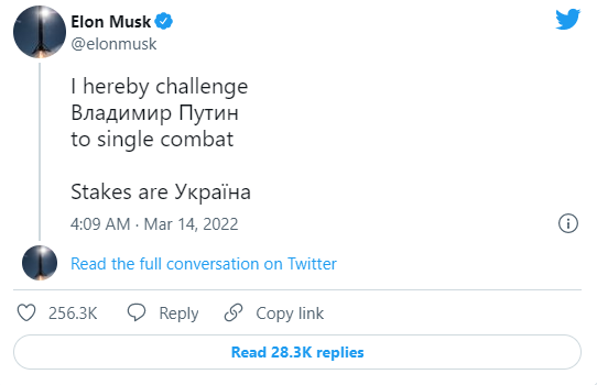 “我在此向弗拉基米尔·普京发起单挑。赌注是乌克兰。”马斯克周一(3月14日)上午在推特上写道,普京的名字和乌克兰是用西里尔字母写的。