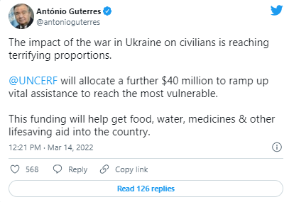 联合国秘书长古特雷斯表示,乌克兰战争对平民的影响正达到“可怕的程度”,他证实,联合国紧急基金将额外拨款4000万美元,以增加援助。