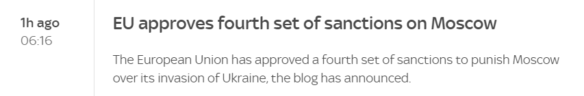 欧盟已批准第四套制裁措施,以惩罚莫斯科入侵乌克兰。担任欧盟轮值主席国的法国在一份声明中表示,这个由27个国家组成的集团已经批准一项针对“参与侵略乌克兰的个人和实体”,以及俄罗斯经济部门的一揽子计划。