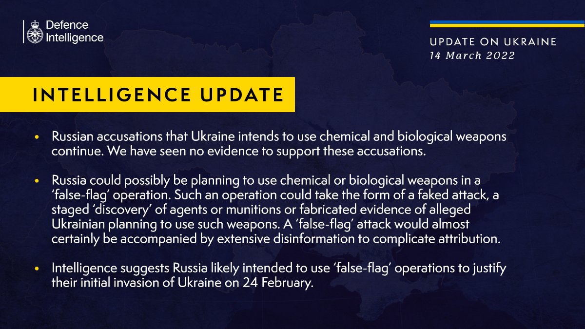 据英国国防部(MoD)官方推特帖文警告称,俄罗斯可能计划在“假旗”(false-flag)行动中使用化学或生物武器。他们在最新的国防情报更新中表示,没有看到任何证据支持,俄罗斯指控乌克兰打算使用化学或生物武器。