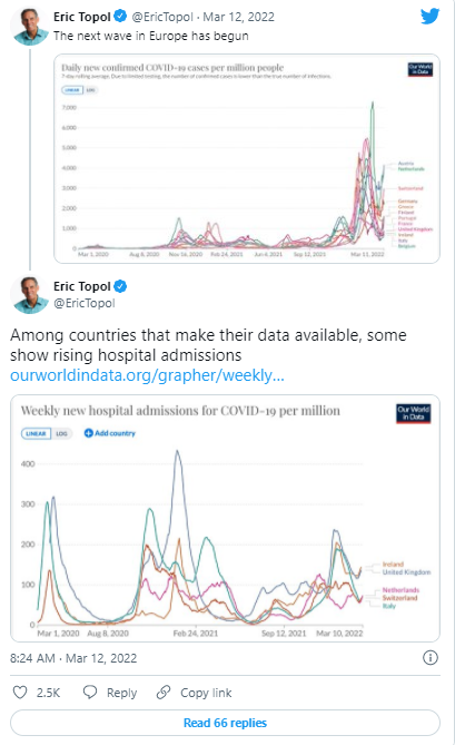 过去一周,英国、爱尔兰、荷兰、瑞士和意大利等国报告的确诊病例和住院病例再次增加。上周六,斯克里普斯研究所创始人兼主任、医学博士埃里克·托波尔(Eric Topol)在推特上写道:“欧洲的下一波浪潮已经开始了。”