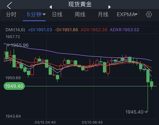 现货金周二亚市早盘短线再度急跌约7美元,最低触及1945.40美元/盎司。