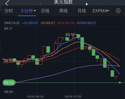 另一避险资产美元自日内高点99.18持续下滑,目前正逼近99关口。