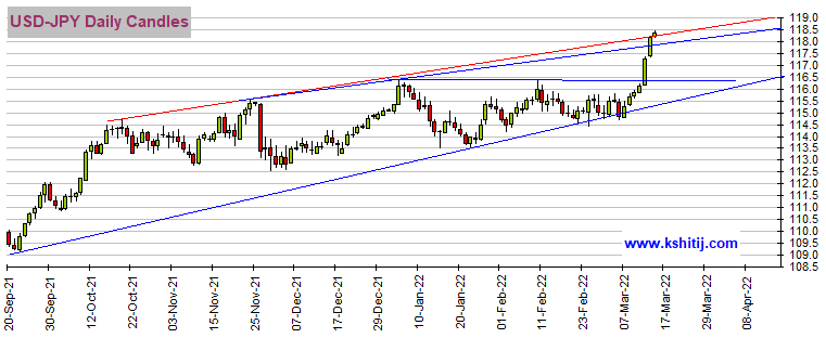 美元/日元持续走高,正升向119-120。假如保持在118上方,那么下一个关键阻力位是119,然后是120。