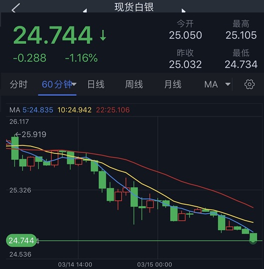 24K99讯 周二(3月15日)亚市尾盘,现货白银维持大跌走势,银价现报24.75美元/盎司附近,日内大跌逾1%。知名财经资讯网站Economies.com周二最新撰文,对日内白银走势进行前瞻分析。