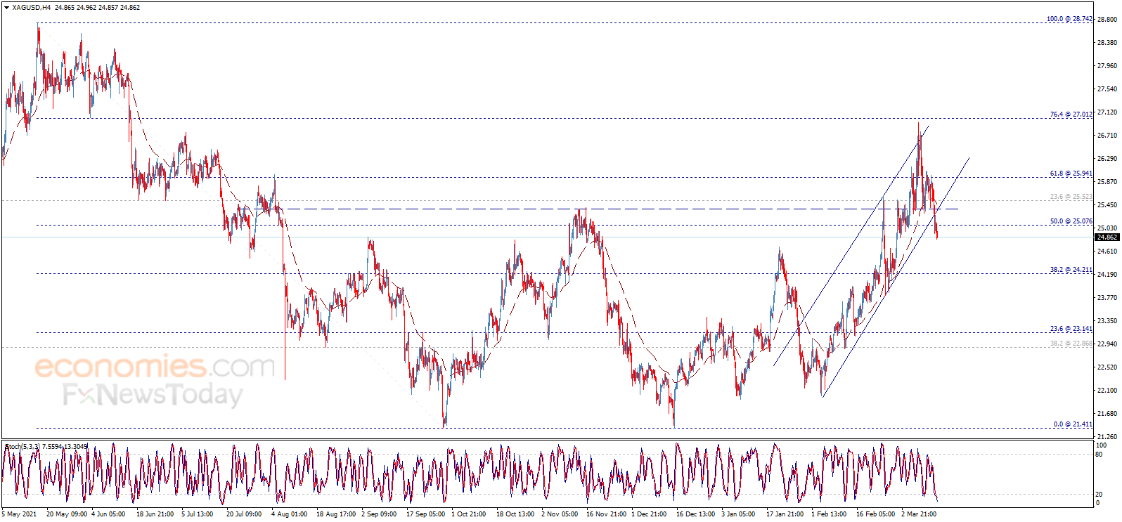 Economies.com表示,因此,我们等待银价在未来几个交易日进一步下跌。需要指出的是,白银继续看空走势的条件是银价维持在25.05-25.40美元/盎司区域下方。