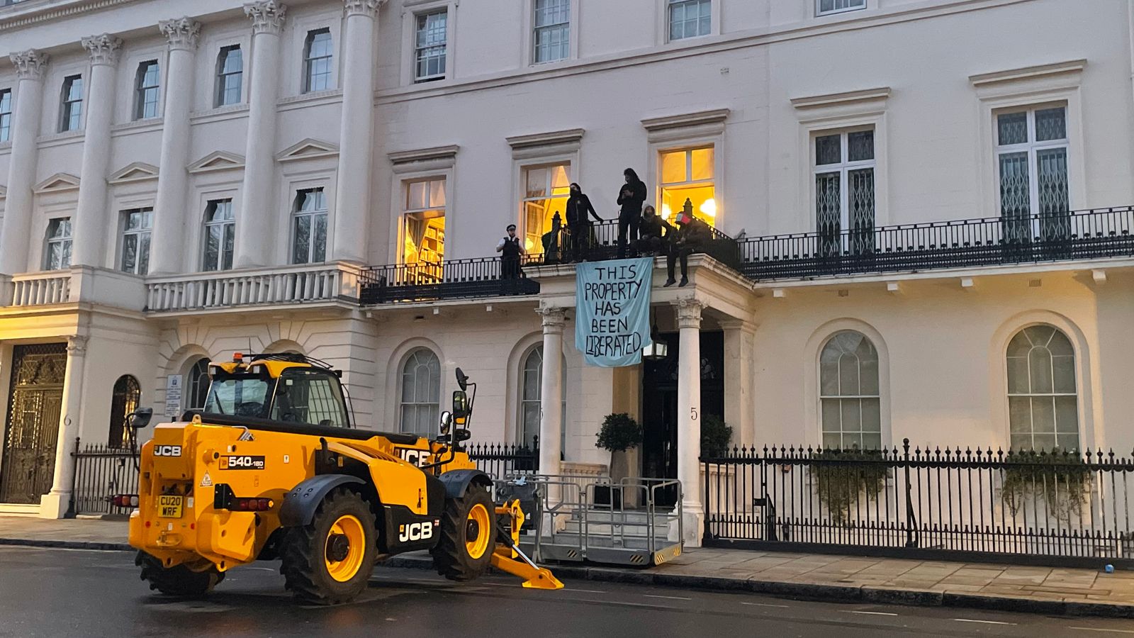 但随后他们离开阳台,威斯敏斯特警方发言人说:“在贝尔格雷夫广场一座建筑物的阳台上抗议的4人已经下来并被捕,警方将留在现场。”这条街早些时候已经被封锁,至少有10辆警车和数十名警察在现场。