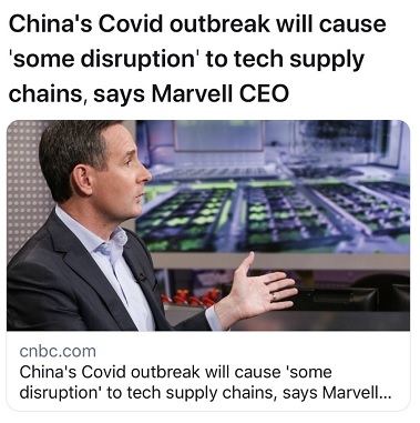 FX168财经报社(香港)讯 由于中国爆发新冠疫情,一些地方政府宣布封城,部分科技公司在当地工厂也因政策封厂。迈威尔科技(Marvell Technology)首席执行官(CEO)Matt Murphy周一(3月14六)警告称,中国主要城市最新一轮的新冠限制措施可能会增加科技行业的供应链挑战。