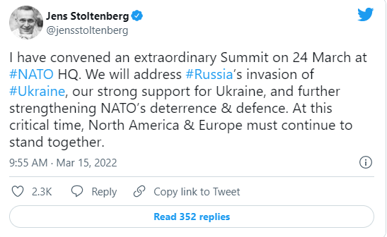 周二早些时候,北约秘书长斯托尔滕贝格说,他与北约领导人召开了这次特别峰会,讨论如何支持乌克兰。目前乌克兰正在进行第三周的战斗,以击退俄罗斯的进攻。