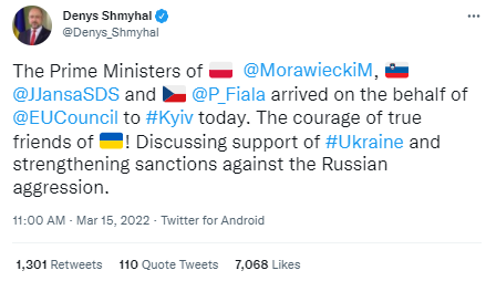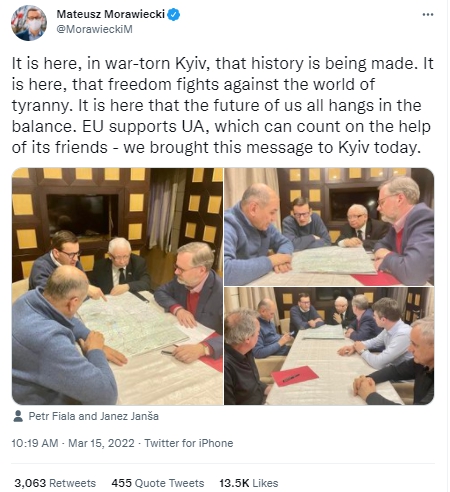 波兰总理莫拉维耶茨基、捷克共和国总理菲亚拉和斯洛文尼亚总理扬萨乘坐火车抵达基辅,这是自2月24日俄罗斯总统普京下令入侵以来,首次有外国领导人对基辅进行此类访问。
