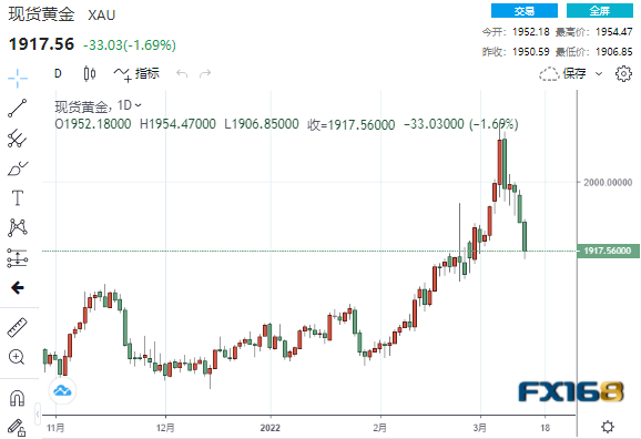 美市尾盘,现货黄金收报1917.56美元/盎司,大幅下跌33.03美元或1.69%,日内最高触及1954.47美元,最低触及1906.85美元。