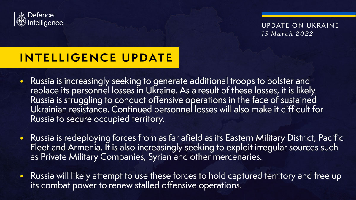 英国国防部最后说,俄罗斯正在从东部军区、太平洋舰队和亚美尼亚重新部署部队,并使用“私人军事公司、叙利亚和其他雇佣军等非正规来源”。