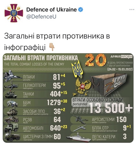 FX168财经报社(香港)讯 俄罗斯入侵乌克兰已经进入第21天。乌克兰国防部当地时间3月15日发表敌军战损报告。数据显示,俄罗斯侵乌损失巨大,自2月24日以来,俄军已有逾1万3500人员阵亡。