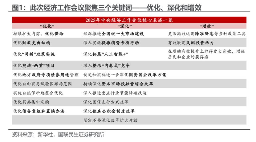今年中央经济工作会议的“题眼”发生了很大的变化,概括成一个字就是“质”。去年在布置经济工作时,强调的是“增长”,讲求的是时机力度——“能早则早、抓紧抓实,保证足够力度”。今年核心突出的是“在质的有效提升上取得更大突破”。如何去做?目标上,既要“积极”,也要“务实”;手段上,则聚焦三个关键词——优化、深化和增效。