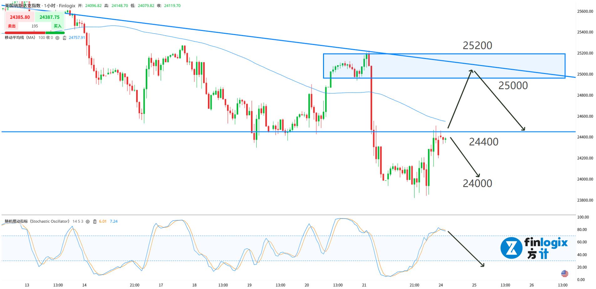 技术面:100均线向下,保持空头趋势。纳指在24400关键支阻互转水平线受阻,随机指标形成超买区死叉,可以考虑进行小止损空单。一旦向上突破,则及时止损。再上方的关键阻力是多重前高点供给区以及下降趋势线压制,阻力更大。