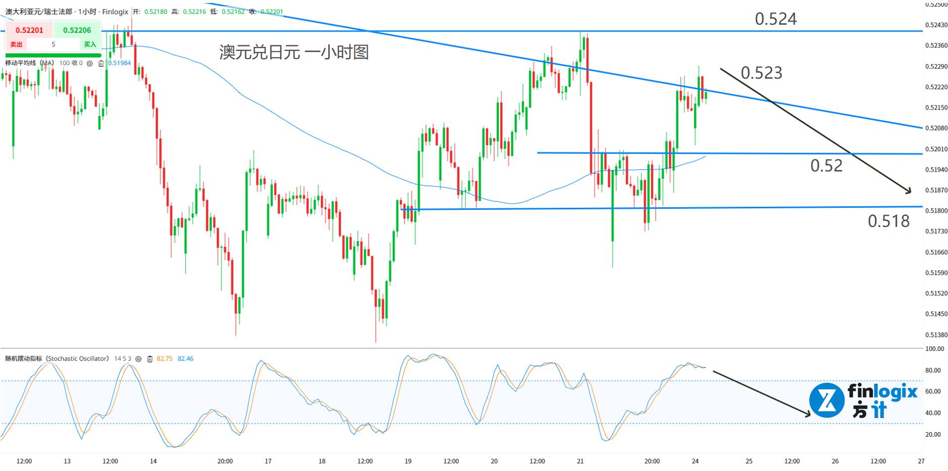 技术面: 100均线微微向上,澳瑞已经有筑底迹象,不过上方还未完全摆脱趋势线和前高点压制。因此可以考虑高位做空,现价位置已经出现随机指标超买区死叉信号,空单入场可以考虑0.523-0.524区间。但如果突破0.525则说明汇率已经转为上涨趋势。