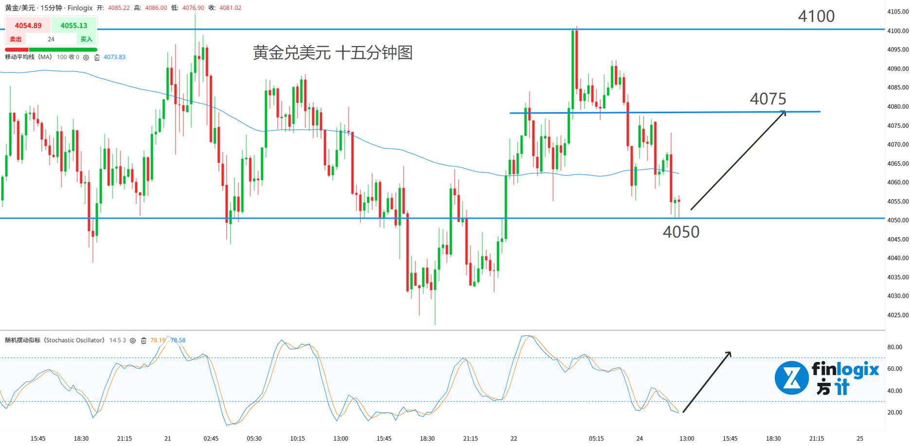 技术面: 100均线水平,金价在4050-4100区间震荡,交易策略和上周一样,低位接多波段交易。不过考虑到金价短暂跌破4050,最低至4030关口,多单入场还是要配合随机指标的超卖区金叉信号。