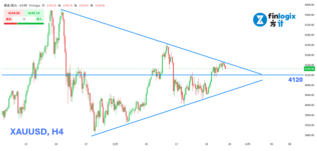 现货黄金昨日上涨 0.8%,收在 4163 美元/盎司。尽管乌俄谈判再现曙光,但市场更关注美联储 12 月降息预期。近期经济数据显示消费增长放缓、PPI 维持稳定,更强化市场对美联储转向宽松的押注。技术面来看,4 小时 K 已突破 4120 颈线,形成短线看涨讯号,可留意顺势布局多单。