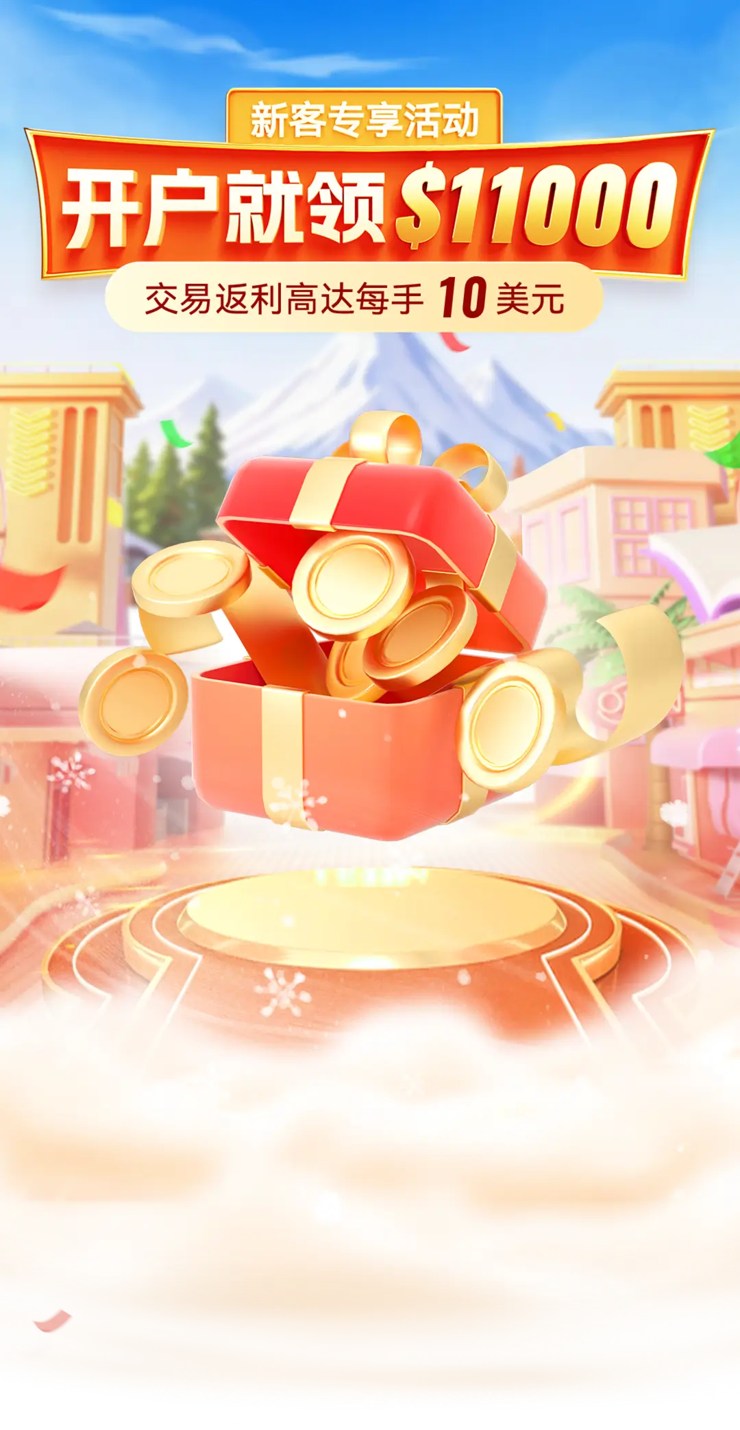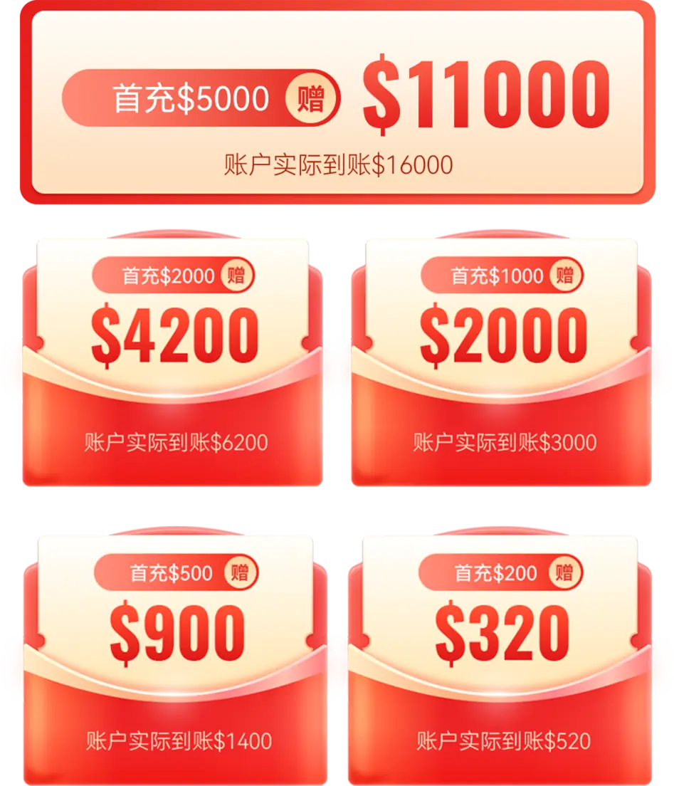 新客户首次充值金额≥$200,联系客服报名参与本活动,成功登记后首笔赠金将发放至客户账户中,可直接用于交易。首笔赠金全部转换为可提取后即可开始领取交易赠金,活动最高可获得11000美元